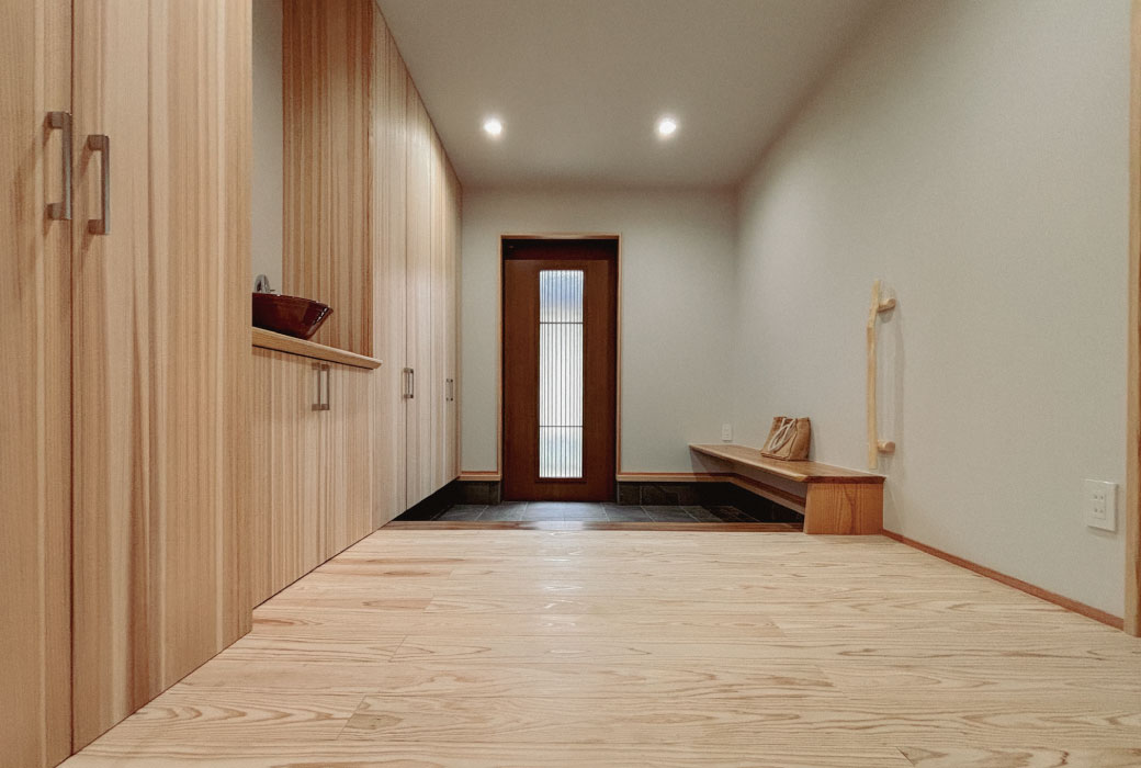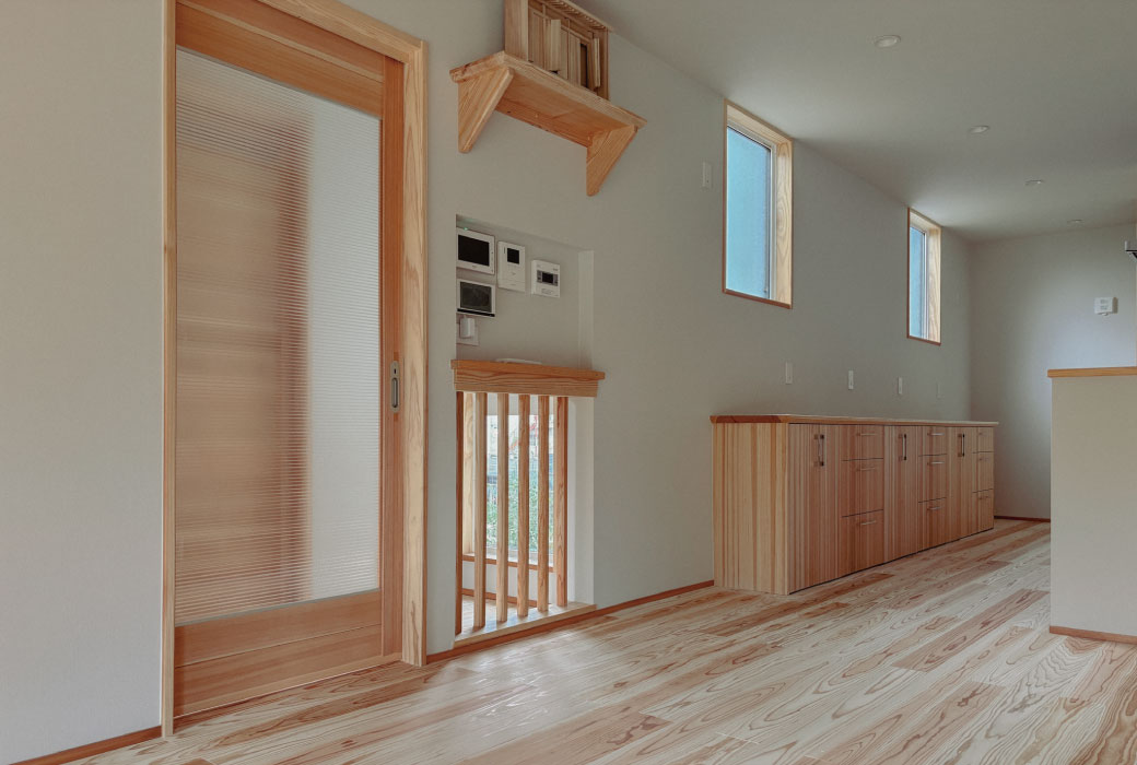 わんちゃんの足を想って床材は杉を選ばれました 広々玄関ホール。ベンチや手すりで使い勝手も抜群 2階には帰省する子どもたちのための居室を リビングから見える場所に腰より下の格子が。 格子の向こうはわんちゃんのためのスペースを。 わんちゃんスペースの小窓からは外が眺められます